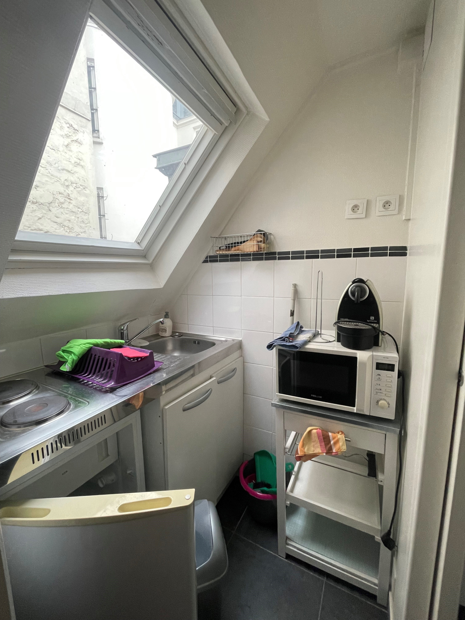 Rue de Rochechouart - Métros Cadet et Poissonnière - A deux pas du Square Montholon - Dans une résidence sécurisée avec gardien - Studio meublé de 16 m² au 4ème étage sans ascenseur - Comprenant une pièce de vie avec kitchenette séparée - Salle d'eau avec wc - Disponibilité au 16 avril 2026