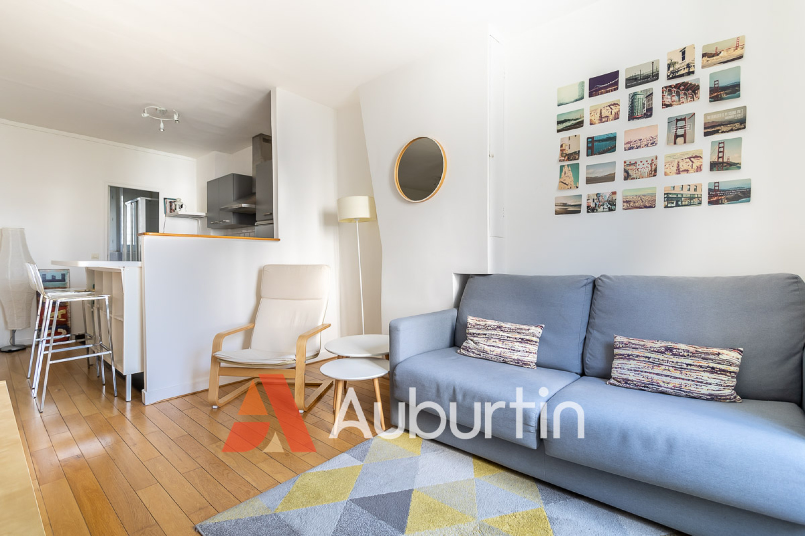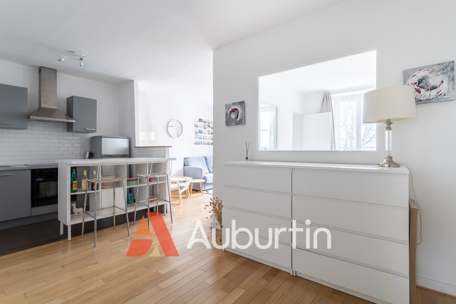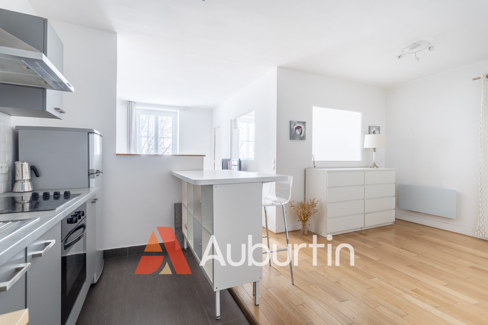 Le salon est spacieux et lumineux, avec une cuisine ouverte entièrement équipée.