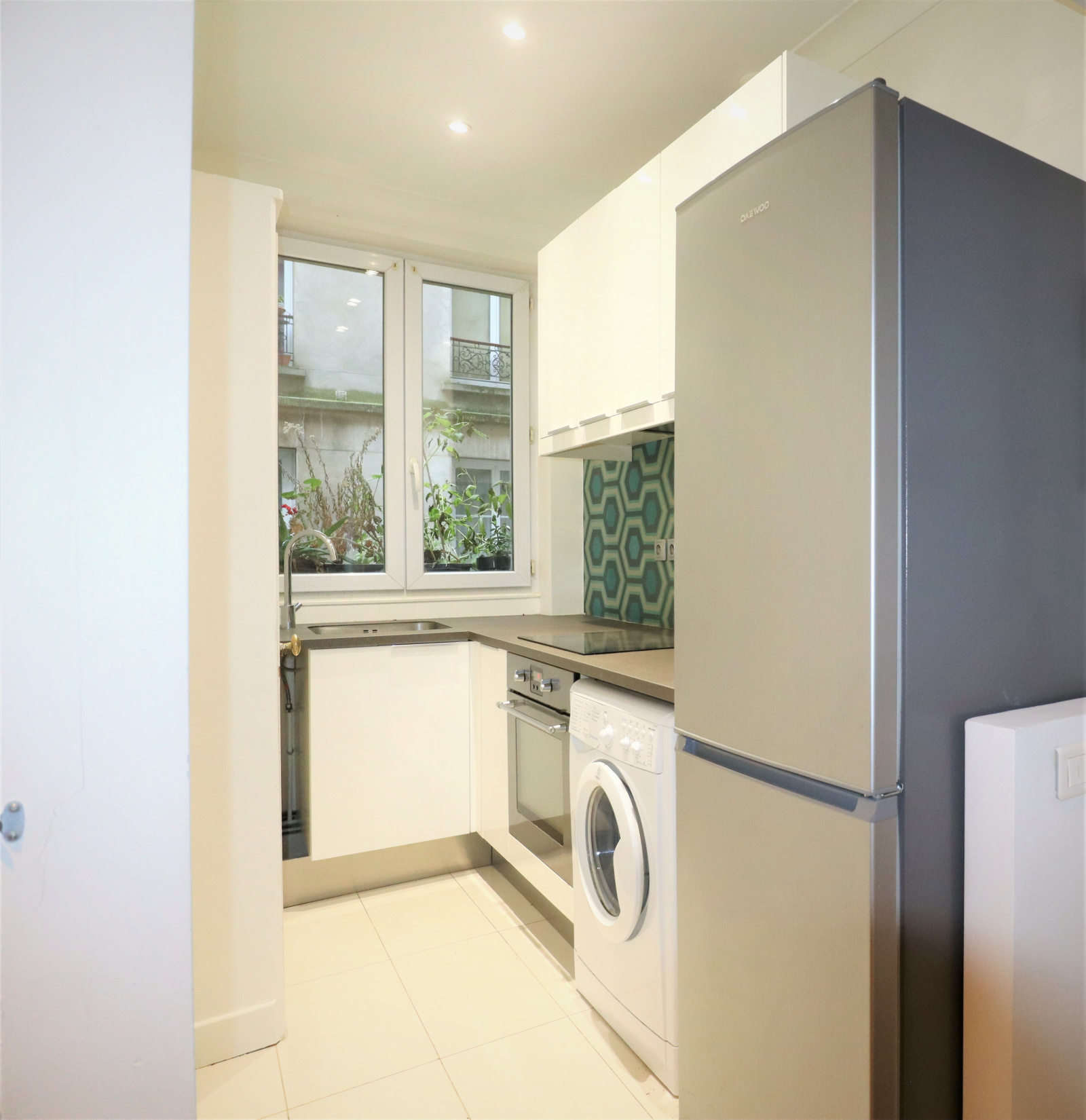 Distribution en étoile comprenant une entrée, un séjour, 2 chambres avec rangements, une cuisine moderne aménagée, une salle d'eau et des wc separés .